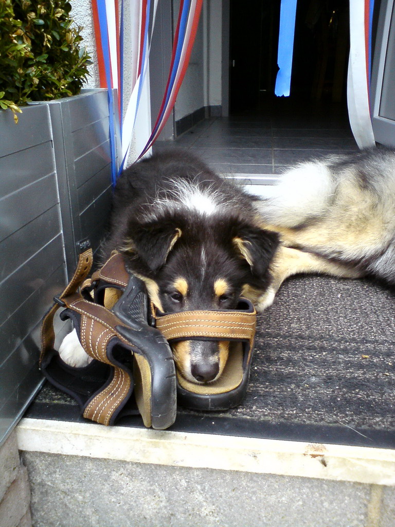 Dabei war Leah immer unsere "Große", und jetzt ist sie so ne süße Kuschelmaus! Entwicklungsbericht: Jacko entwickelt sich prächtig. Er wächst und gedeiht, sein Fell ist schwarz und glänzend (außer aufm Kopp, da huhnt er noch ein bißchen). Er ist super leinenführig, mit 6 Monaten hat er einen kleinen Agility-Parcour 1a hingelegt! Seine Schnauze klebte an meinem Bein, er verlor meine Augen nicht aus den Augen. Rechts, links, durch den Tunnel, über eine Bank, zack, zack, als hätten wir es schon 1000x gebübt! Ein super Erlebnis! Leah und er sind ein Herz und eine Seele. Sie kletten aneinander und teilen sich Bett und Leckerlies. Soll heißen: Leah frisst erst, wenn sie sieht, dass Jacko auch was bekommt. Sie ist ein Seelchen, ich liebe sie so sehr und hoffe, dass sie mir noch sehr sehr lange erhalten bleibt. Jacko hat keine Lust auf Ballspiele, lieber Rumräubern und Rumkaspern, da mir aber wichtig ist, dass BEIDE Hunde gut auf die Familie abgestimmt sind ist mir die Abrufbereitschaft und Leinenführigkeit das wichtigste Training überhaupt. Ansonsten gehts uns allen gut, und ich habe mich im Urlaub besonders darüber gefreut, dass Leah immer sehr viel Aufmerksamkeit erregt hat durch ihr hübsches Aussehen und dass Jacko im Allgemeinen als kleiner Border Collie erkannt wurde. So, heute hab ich wieder mehr Luft, die Schule hat begonnen! Ich freue mich wieder über regen Gedankenaustausch! LG Mellie
