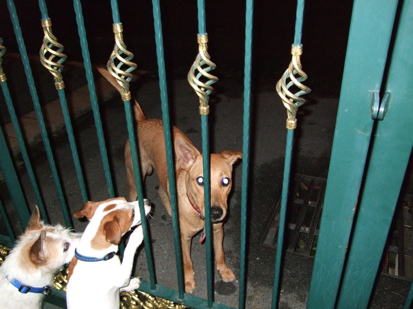 Bei unserem letzten Spaziergang vorhin, war leider das Flutlicht schon aus, normalerweise ist das bis nachts um 2 an... somit war es leider nicht zu sehen, ob Hunde da sind oder nicht... Lissy hab ich vorsichtshalber nicht von der Leine gelassen... mein Freund war mit und hat mit Toby gespielt. Wir haben vor ein paar Tagen, einen Fussball gefunden, auf den ist Toby total heiss... der Ball ist zwar fast groesser als er, aber hinter dem herrennen und ihn an irgendeinem abstehenden Lederfetzen rumtragen macht ihm total Spass. Als ich mit Lissy auf dem Weg am Klettergeruest vorbeigegangen bin, sah ich nur noch wie 2 Hunde aufgesprungen sind und Richtung Strasse gerannt sind... habe erkannt das es eine der Huendinnen war und einer der weissen Welpen.... naja Welpen sind es mittlerweile ja nicht mehr wirklich... War heilfroh, das mein Freund zu dem Zeitpunkt mit Toby noch weit hinter uns waren.... da er mit Sicherheit hintern denen hergerannt waere wenn er sie gesehen haette... Lissy wollte, aber ich hatte die Leine fest im Griff. Empfand es aber sehr interessant, das sie als wir so nahe waren weggelaufen sind... aber es waren halt auch nur 2 und nicht das komplette Rudel.... naja danach durfte Toby dann nicht mehr hinter dem Ball herhechten wie er wollte.... zieh im deswegen schon immer das Geschirr an, da kann er sich reinhaengen lg