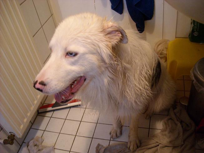 Wenn ich Becks bade, ist das wie mit Kleinkindern.. Erst freuen die sich, dann sehen sie das Wasser, dann heulen und schreien sie wie wild, dann sitzen sie drin und fügen sich ihrem Schicksal... Und wenn sie dann erst einmal wieder draußen sind, sind sie glücklich und zufrieden und vorallem huuundemüde. :) Er hat danach wohl erstmal 4 oder 5 Stunden ganz tief durchgeschlafen. :)