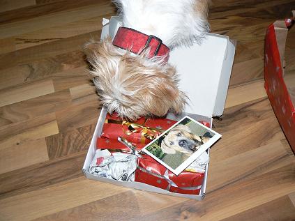 1 tolles Bildchen von dem Hund der Päckchenpackerin