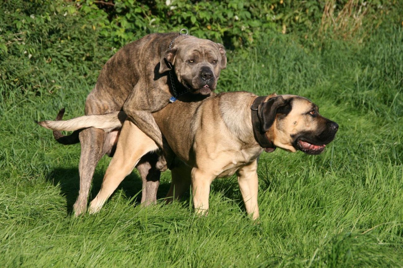 Hallo Heike, Lennox ist jetzt 15 Monate alt, 70 cm groß und gute 48 kg schwer. Die Höhe dürfte nun so bleiben, an Gewicht wird er evtl. noch etwas zulegen. Ich halte ihn extra schlank um seine Knochen und Gelenke im Wachstum zu schonen. Er braucht trotzdem 3 % seines Körpergewichtes an Futter, da er viel bewegt wird und entsprechenden Bedarf hat Das ist seine Mutter, eine Cane Corso Hündin namens Kessy. Sie ist 68 cm groß und 55 kg schwer. Das ist sein Vater, ein Antikdoggenrüde namens Amon. Er ist 70 cm groß und 60 kg schwer. Und das sind die Beiden beim Deckakt Mal schauen, was Lennox noch an Gewicht zulegt. Ich hätte nichts dagegen wenn er so bleiben würde, denn so gefällt er mir sehr gut. Die Wahrscheinlichkeit, dass noch ein paar Kilo drauf kommen ist hoch, da er noch im Wachstum ist und das glaube ich bis zum vollendeten 3. Lebensjahr, soweit ich richtig informiert bin. Optisch kommt er sehr nach seinem Vater, wenn man mal von der gestromten Farbe absieht. Selbst wenn er 100 kg auf die Waage bringen würde, er ist und bleibt mein Lennoxbaby Soviel zu meinem "süßen" Lennox