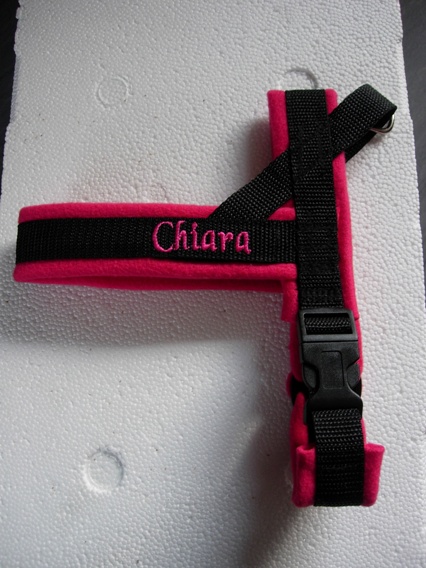 Der Clou an dem Geschirr ist, das man es besticken lassen kann, ich hab mir den Namen meines Hundes und unsere Telefonnummer sticken lassen.