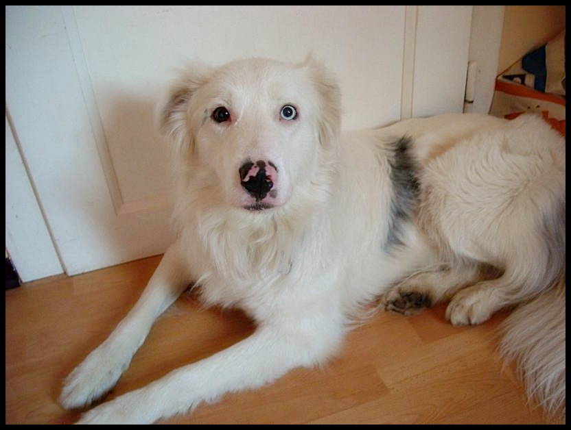 Dazu, dass mein Hund eine Fehlfarbe hat, kommt noch, dass er sogar zwei verschiedene Augenfarben hat und trotzdem KERNGESUND ist.