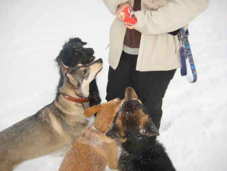 dann möchte ich euch auch mal ein paar bilder von meiner chaos bande zeigen. es handelt sich um meine hündin "bailey" (die kleine braune), dem rüden "qizmo" von meinem freund (husky/schäfer), und von der "ricky" (husky/windhund), die eigentlich meinem freund gehört, aber irgendwie mehr auf mich bezogen ist. der große schwarze hund wo ab und zu mit auf den bilder auftaucht, ist die hündinn "kira"meiner freundinn.