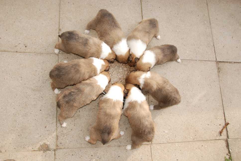 9 Colliewelpen bei ihrer Lieblingsbeschäftigung