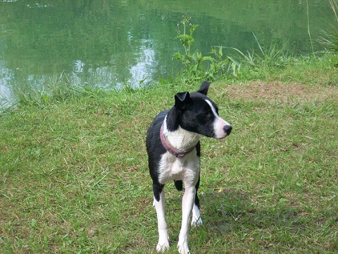Hier meine kleine Kira - schwarz, weiß - Jack Russell, Boarder Collie etc - Mix - bisschen übern Jahr jung - Kriegsverletzung am Beinchen durch Steckie, das ausm Boden stand