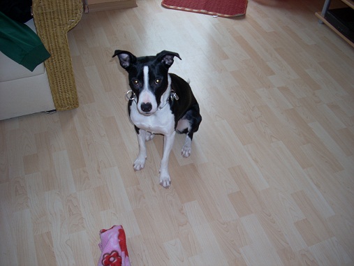 Hier meine kleine Kira - schwarz, weiß - Jack Russell, Boarder Collie etc - Mix - bisschen übern Jahr jung - Kriegsverletzung am Beinchen durch Steckie, das ausm Boden stand