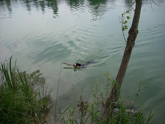 Kira, die Wasserratte, brav ihr Stecki apportierend