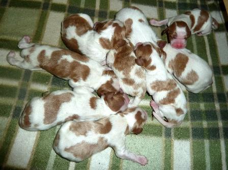 Am 12. Mai war es dann so weit, drei Tage zu früh bescherte mein Hund mir den Nachwuchs. Nachdem der erste Schock vergangen war freute ich mich inzwischen auf den Nachwuchs. Alles verlief problemlos, außer das mein Hund gar nicht aufhöhren wollte mit dem Kinder kriegen. Vier, fünf, sechs,...! Da hat die TA aber wirklich schlecht gezählt, mit neun sind es mehr als doppelte so viele! Einer schöner wie der andere. Einfach zu niedlich.