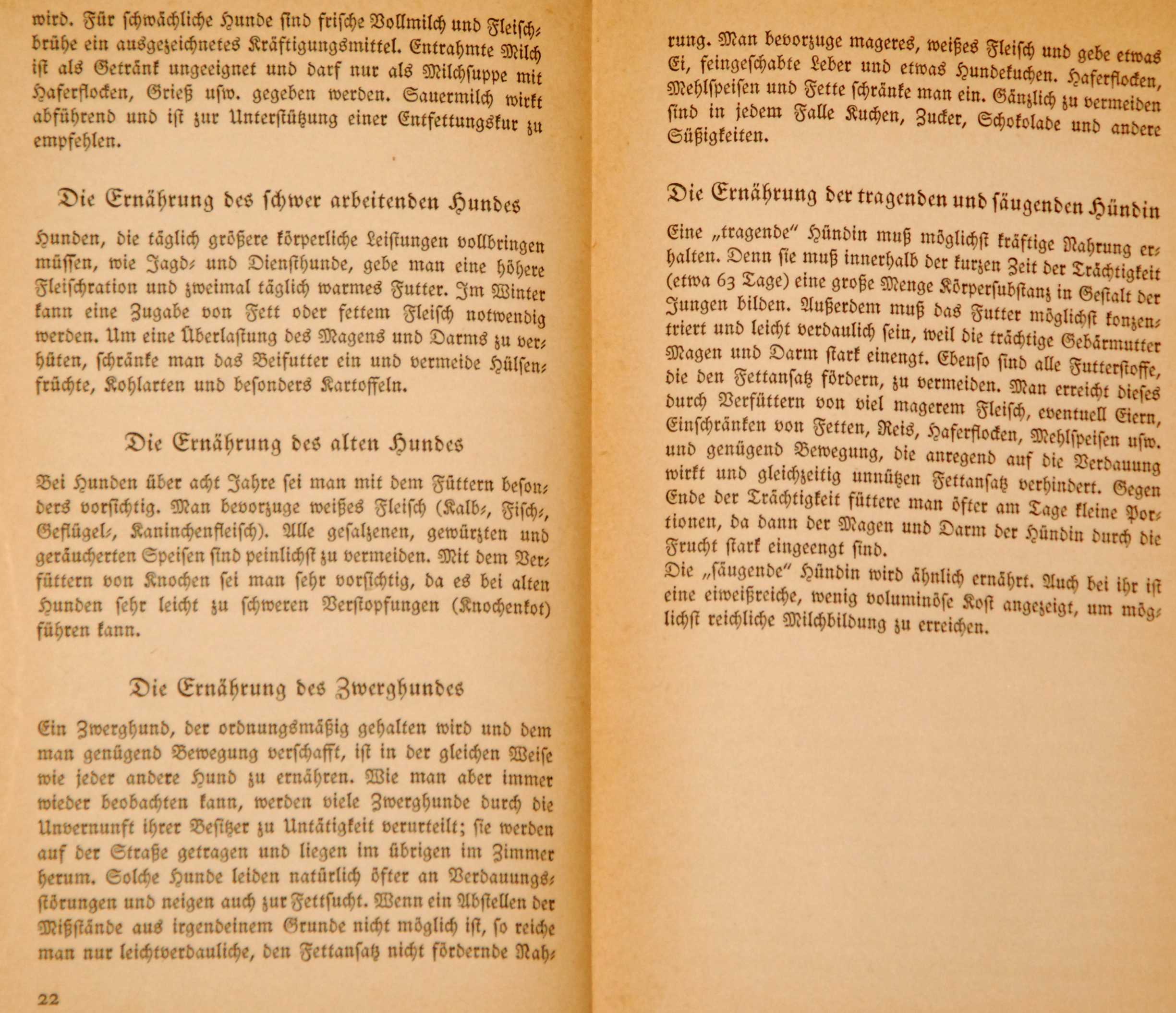 da ich zu faul bin, etwas abzuschreiben, hier gleich als Fotokopie die Original-Empfehlung aus einem Ratgeber, geschrieben von einem Fachtierarzt für Hunde und Katzen, erschienen 1937 in Berlin. Nur so zum Vergleichen, nicht etwa, um Euch das jetzt aufzuquatschen. Hier liest man noch die Empfehlung, ein Drittel Fleisch und Knochen, zwei Drittel "Beifutter" zu geben, das vor allem aus eingeweichtem, getrocknetem Brot und gekochtem Gemüse bestehen sollte. Nur richtig hart arbeitenden, trächtigen und säugenden Hunden sollte man mehr Fleisch füttern.