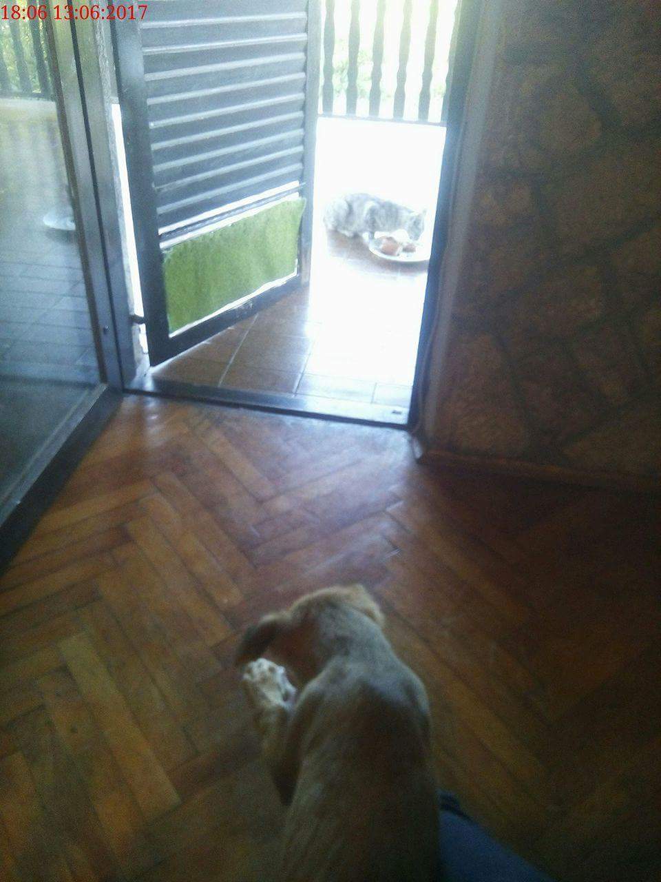 Re: welpe zugelaufenNoch ein bild nachbars katze frisst charlies futter er schaut nur zu, als die katze später weg lief hatt er den rest gefressen obwohl er grösser ist als diese katze